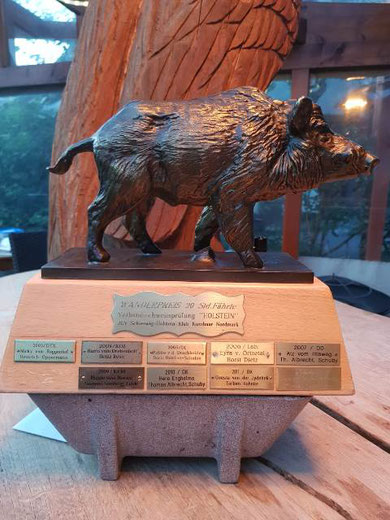Mit dieser Leistung konnte das Gespann die Prüfung nicht nur überaus erfolgreich abschließen, sie sicherten sich als i-Tüpfelchen an diesem Tag auch noch den Suchensieg. Damit tritt Ayka von Overndorf in die Fußstapfen ihres Vaters vW Arven von Königsdamm, der sich mit dem Suchensieg im Jahr 2014 bereits auf dem Wanderpokal verewigte. Ein Jahr darf sich Holger Thies nun an dieser schönen Trophäe erfreuen. Gratulation zu dieser hervorragenden Leistung und stets viel Suchen- und Weidmannsheil.