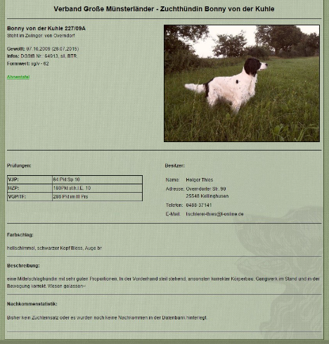 Beschreibung: Eine voll dem Typ entsprechende Hündin des Mittelschlages. Im Wesen lebhaft, Auffälligkeiten nicht feststellbar. Stockmaß 60 cm